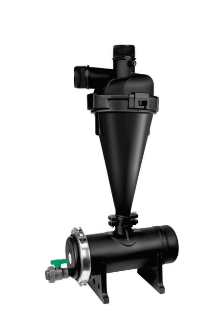 Hidrocikloninis filtras 2" Darbinis slėgis nuo 2 bar iki 6 bar Vandens pralaidumas 25m³/h Centrifuginis smėlio separatorius (Hidrociklonas) pagamintas iš plastikinio medžiagos (sustiprintas poliamidas). Tinka smėlio ar sunkesnių dalelių (akmenų, šakų, dulkės, atliekos ir kt.) atskyrimui iš vandens, kuris gaunamas iš šulinių, upių, ežerų ir kitų vandens rezervuarų. Įeinantis vanduo centrifugine jėga greitai sukuria sūkurį ir priverčia sunkesnes daleles nusistovėti apačioje, kur jos kaupiamos konteineryje. Norėdami ištuštinti konteinerį, tiesiog atidarykite ištuštinimo vožtuvą. Gamintojas: Irritec (Italija)