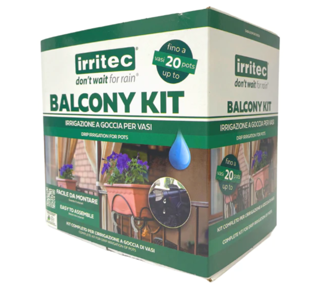 BALKONO APŽELDINIMO KOMPLEKTAS SU 20 LAISTYMO TAŠKAIS - IRRITEC Balkono komplektas skirtas integracijai į jūsų namų sistemą, tiesiogiai jungiant jį prie 3/4" sriegiuotos išvesties naudojant komplekte esantį adapterio detalių, kuris paverčia sriegiuotą išėjimą į mikro vamzdžio jungtį, kuri bus naudojama kaip šakotuvas įvairioms lašelinėms laistymo sistemoms. Leidžia laistyti iki 20 puodų ar balkono dėžių tiesiai žemėje, dėka komplekte esančių lašelinės su kuoliuku. Komplekte yra: 1 x Slėgio reguliatorius lašeliniams 1 x 3/4” adapteris 4mm vamzdžiams 20 x lašeliniai eilėje ant stovo 1 x PVC vamzdžių ritinys 4 mm 25 metrai 3 x T-formos jungtys 4mm vamzdžiams 2 x vožtuvai 4mm vamzdžiui 10 x užbaigimo detalės 4mm vamzdžiui Pagaminta: Irritec (Italija)