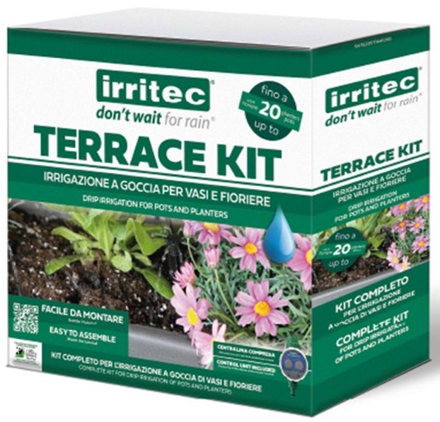 Pilnas Irritec Terrace apželdinimo komplektas skirtas integracijai į jūsų namų sistemą ir leidžia laistyti iki 20 puodų, dėka komplekte esančių lašelinų su matavimo prietaisu. Komplektą lengva surinkti, ir jam nereikia jokių profesionalių įrankių. Komplekte yra: GreenTimer Evo maišytuvo laikmatis Slėgio reguliatorius lašelinėms 20 x lašelinės su reguliuojamomis srovėmis iki 45 cm skersmens (srauto greitis nuo 0 iki 40 litrų per valandą) 1 x ritinys 25 metrų polietileno vamzdžio Ø16 mm 1 x ritinys 25 metrų PVC žarnos lašelinėms 6×4 mm 1 x jungtis 16 mm polietileno vamzdžiui: 1 x paleidimo jungtis 3 x kampinės jungtys 90° 2 x trišakiai 1 x žarnos jungtis 3 x galiniai uždarymo dangteliai 1 x vožtuvas 16 mm polietileno vamzdžiui 1 x skylės gręžimo įrankis Pagaminta: Irritec (Italija).