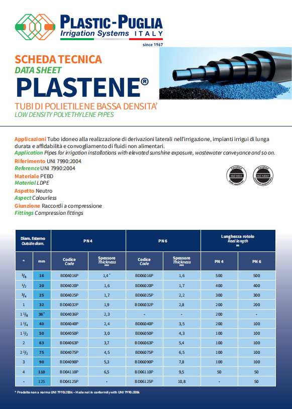 LDPE vamzdis laistymo sistemų įrengimui PLASTENE yra žemo tankio polietileno vamzdis PE32, juodos spalvos su išspausta mėlyna juostele viršuje, nešalinamu ženklinimu, pagamintas iš atrinktų medžiagų, užtikrinančių ilgą tarnavimo laiką ir aukštą patikimumą, atitinkantis UNI 7990:2015 standartus. PLASTENE vamzdis tinka požeminių laistymo sistemų, antžeminių, atviro lauko ir šiltnamių gamybai, naudojant žemą darbinį slėgį. Jis taip pat naudojamas ne maisto produktų skysčių transportavimui. Naudojimas: Šiltnamis – Atviras laukas – Medelynas Savybės Žaliava: polietilenas PE32 Atsparus UV spinduliams, mikroorganizmams ir pelėsių grybams Atsparus sūraus vandens, rūgščių ar šarmų poveikiui, dažnai naudojamam žemės ūkyje. Atitinka standartus: UNI 7990:2015