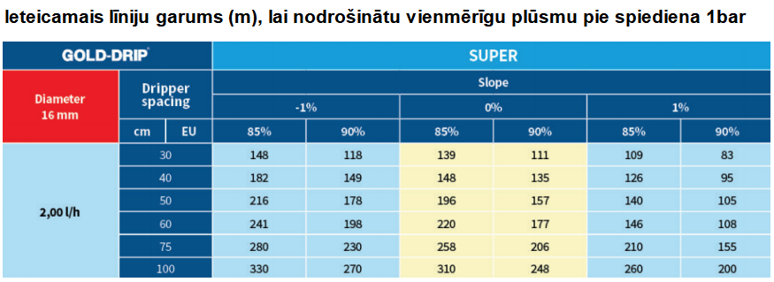 GOLD-DRIP SUPER yra lašinimo vamzdis su standartiniu cilindrinio tipo lašintuvu ir turbulencine srove, įmontuotu dvigubu įsiurbimo filtru. SUPER yra pažangiausia ir ekonomiškiausia versija su 3 dozavimo angomis, kompaktišku lašintuvu, užtikrinančiu minimalius slėgio nuostolius ir puikią drėkinimo vienodumą visoje laistymo zonoje. Galima įsigyti su įvairiais lašelių atstumais. Idealiai tinka ilgalaikėms paviršiaus drėkinimo sistemoms. Emisijos vienodumas visoje zonoje. Atsparus mechaninei montavimui. Aukštas atsparumas UV spinduliams, chemikalams ir rūgštims, naudojamoms žemės ūkyje. Galimybė surinkti, perdirbti ir panaudoti pakartotinai. Lašinimo vamzdis atitinka UNI EN ISO 9261 standartus ir sertifikuotas IIP (Italijos plastikų instituto). Naudojimas: Šiltnamiai, atviras laukas. Gamintojas: Plastic-Puglia (Italija)