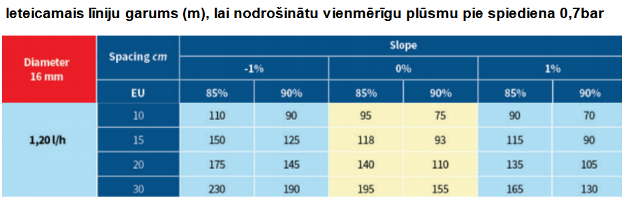 Lašinimo vamzdelis iš juodo polietileno su mėlyna juostele, kuri nurodo lašinimo vamzdelio padėtį aukštyn. Montavimas ant žemės paviršiaus arba šiek tiek po žeme Žemos montavimo ir priežiūros išlaidos Tolygus išmetimas ir puikus trąšų dozavimas ilgose linijose Dvigubas vidinis nuolatinis filtras užtikrina puikų atsparumą užsikimšimui Linijinis vandens išvedimas užkerta kelią šaknų įsiskverbimui ir atlieka atgalinio srauto funkciją. Atsparus mechanizuotam montavimui Aukštas atsparumas užsikimšimui, UV spinduliams, chemikalams ir žemės ūkyje naudojamoms rūgštims Lašinimo juosta atitinka UNI EN ISO 9261 standartus ir yra sertifikuota IIP (Italijos plastikų institutas) Naudojimas: Šiltnamiai, atviras laukas Gamintojas: Plastic-Puglia (Italija)