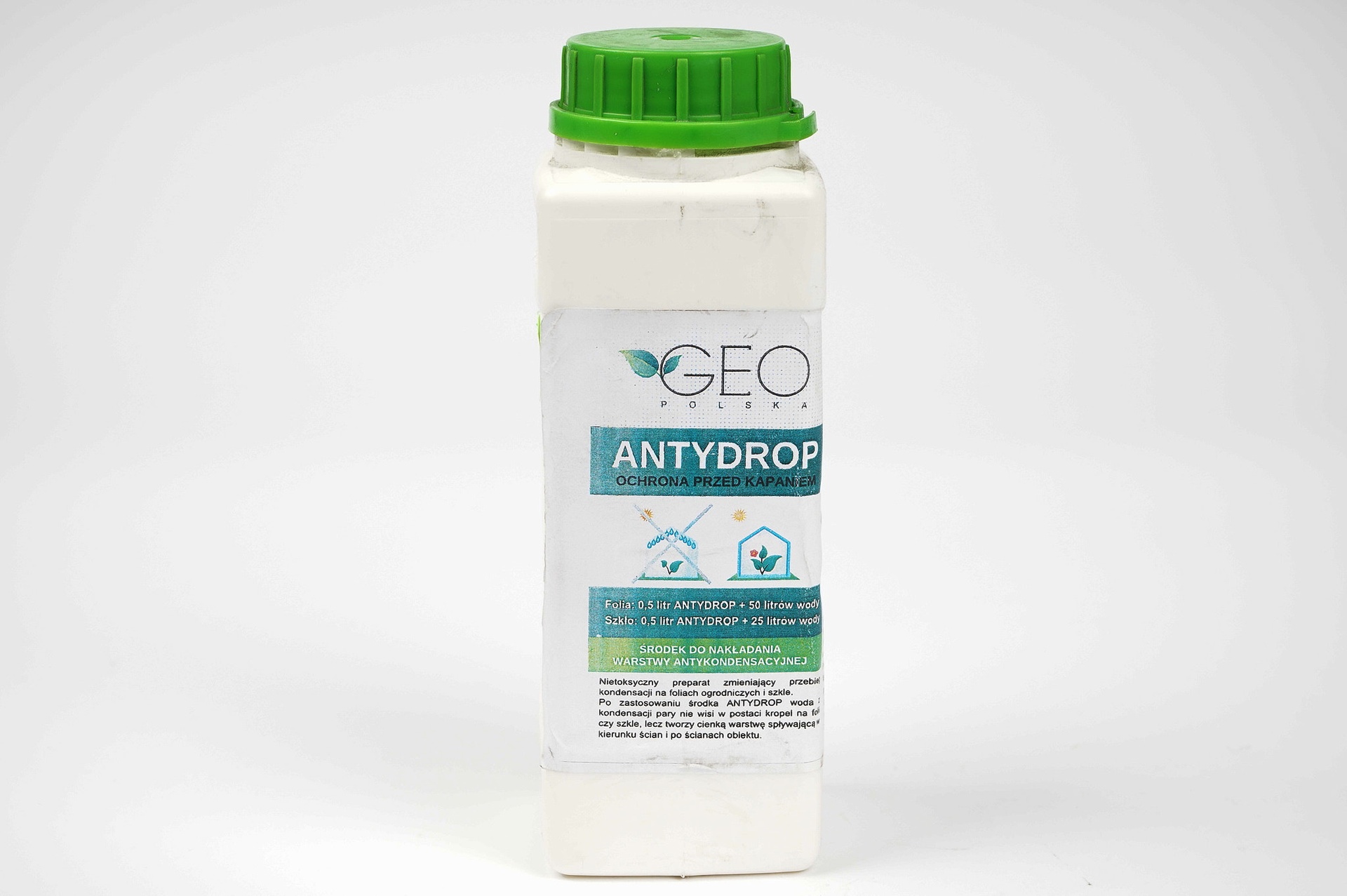 Naudojimas: Šiltnamių plėvelei: 1 litrą ANTYDROP sumaišyti su 100 litrais vandens (pageidautina distiliuoto arba lietaus), jei plėvelė nėra švari arba drėgna - su 50 litrais vandens. Stiklui: 1 litrą ANTYDROP sumaišyti su 50 litrais vandens (pageidautina distiliuoto arba lietaus vandens). Padidina šviesos pralaidumą iki 17%, Savybės: Padidina saulės šilumos kiekį šiltnamyje, mažindamas šildymo išlaidas; Mažina augalų jautrumą infekcijoms (pvz., pilkajai puviniai); Neleidžia kondensatui lašėti ant kultūrinių augalų; Antistatinis; Be toksiškų priemaišų; Aukštas našumas: 500-1000m2; Ilgalaikis efektas: 2 - 5 metai.