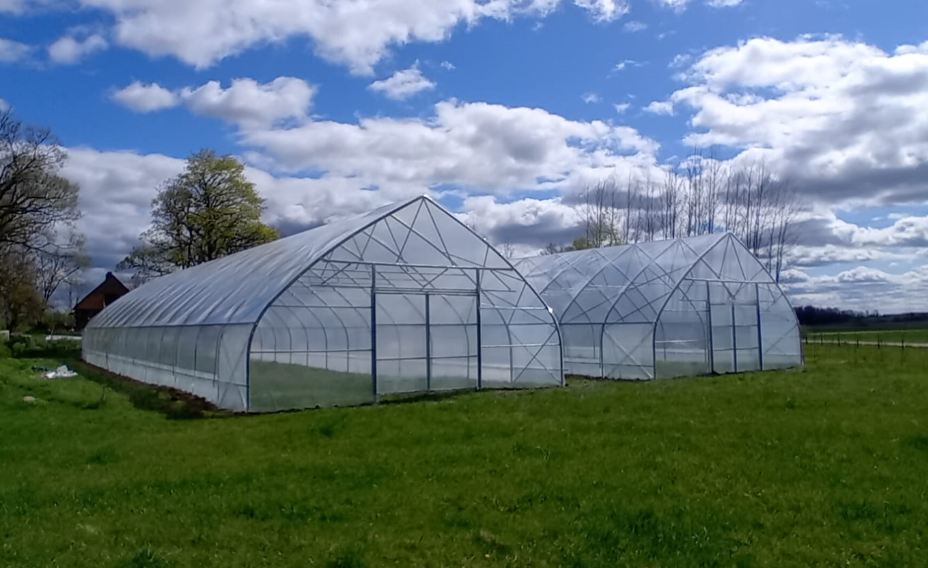 Plėvelės šiltnamis su šonine ventiliacija abiejose pusėse, pravažiuojami vartai abiejuose galuose 2.8x2.5m.